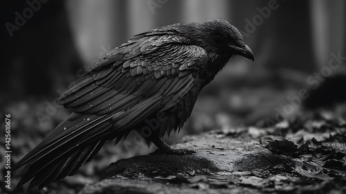 © Kabel, Naklejka premium Raven perched on rock, forest backdrop