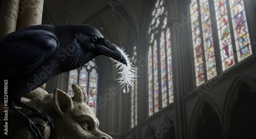 © ajib ajib, Fototapeta premium Raven perches on gargoyle in cathedral showcasing feather and stained glass detail