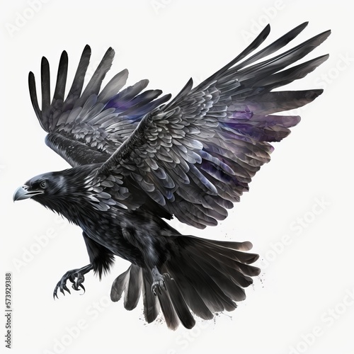 © Dzmitry, Naklejka premium Raven spread its wings Fly on a black and white watercolor drawing Generative AI