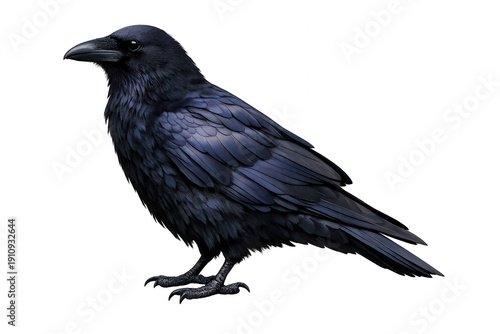 © Komora, Obraz premium Raven standing, looking left, featuring detailed dark feathers, intelligent eyes, and a sharp beak. Transparent background