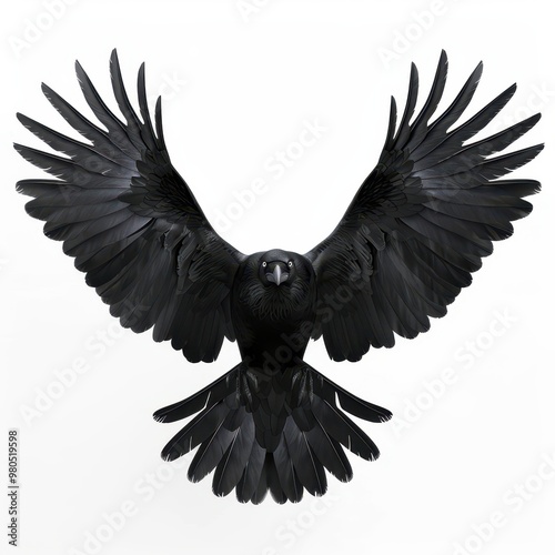 Fototapeta premium Raven with wings slightly spread, black feathers, sharp beak and intense eyes, isolated on a white background.