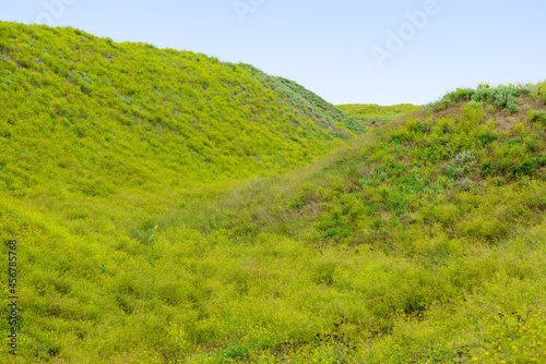 Naklejka premium Ravine and hills covered with green grass on a summer day