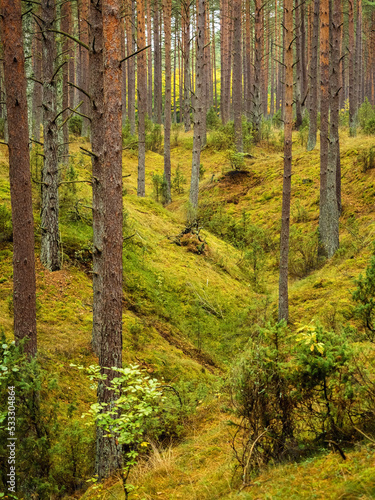 Fototapeta premium ravine in old deep pine woodland in autumn season