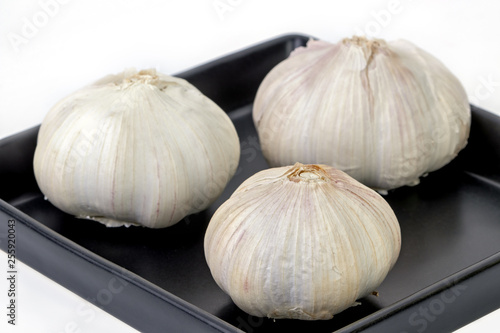 Obraz premium Raw and unpeeled garlic on balck dish on white