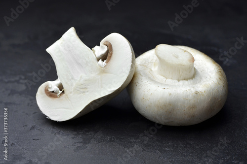 Fototapeta premium Raw champignon mushrooms, whole one and half, black slate background. Vegitarian food cooking.