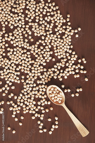 © Andriy, Fototapeta premium Raw chickpeas in a wooden spoon scattered on a wooden background. Top view. Copy, empty space for text