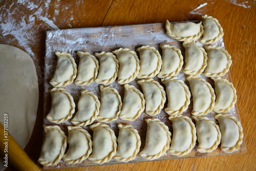 Fototapeta premium Raw materials for making Pierogi with potatoes, which are prepared for cooking