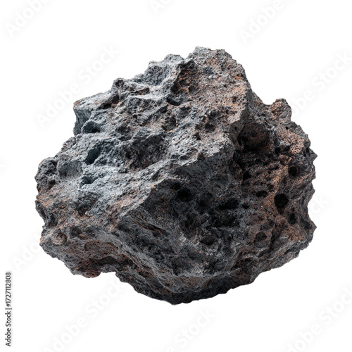 © Rojob, Fototapeta premium Raw natural volcanic lava rock isolated on white background – rough textured stone, geological mineral specimen, igneous rock surface design.