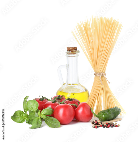Fototapeta premium Raw spaghetti pasta and different ingredients isolated on white