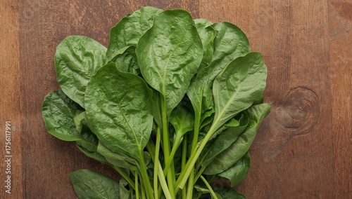 Fototapeta premium Raw spinach leaves displayed on a rustic wooden surface