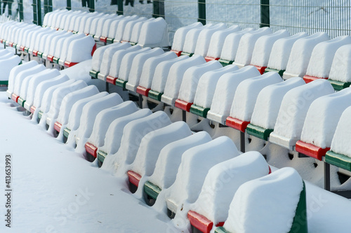 Fototapeta premium Raws of outdoor stadium seats heavily covered with snow