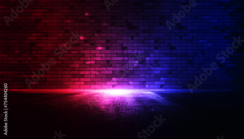 © Miha Creative, Fototapeta premium Rays neon light on neon brick wall. Empty scene.