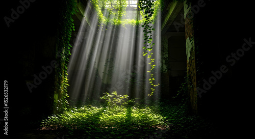 Obraz premium Rays Of Light In An Abandoned Place With Green Plants