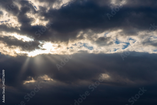 © ARVD73, Fototapeta premium Rays of light shining throug dark clouds.Beautiful dramatic sky with sun rays.