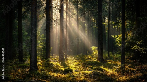 Fototapeta premium Rays of Light Through a Serene Forest Scene