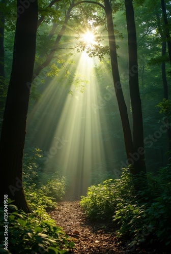 © Jonni78, Obraz premium Rays of sunlight creating a divine light effect in a dense green forest