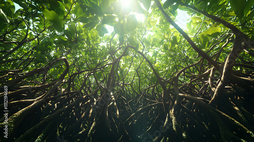 Fototapeta premium Rays of sunlight illuminate a dense forest with intertwined tree trunks and vines, creating a mystical and serene atmosphere..