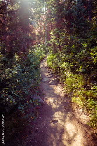 © Jon, Fototapeta premium Rays of sunlight illuminating a forest pathway near Fish Creek Falls in Colorado