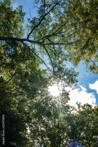 Fototapeta premium rays of sunlight streaming through trees on a sunny day