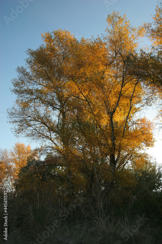 Naklejka premium Árbol en otoño iluminado por el sol al amanecer. Río Segura, Cieza (Murcia-España).