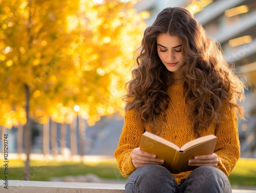 © mongkonchai, Obraz premium Reading a book autumn park lifestyle image natural setting close-up view serenity and reflection