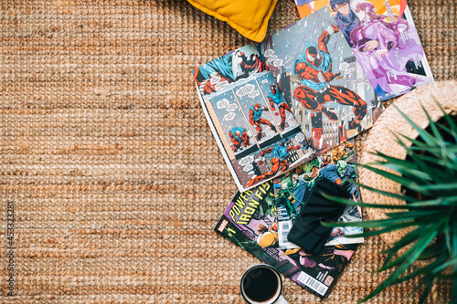 Naklejka premium Reading comic books and manga on the carpet at cozy home. Rostov-on-Don, Russia. 22 August 2021