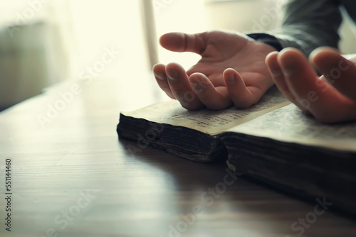 © alexkich, Fototapeta premium Reading religious literature. A man studies the Koran and sorts out the rosary.