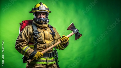 © DigitalArt Max, Obraz premium Ready for emergency response, firefighter in full gear with axe and helmet stands against a green screen backdrop alone.