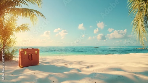 © ali, Obraz premium Ready for paradise A vintage suitcase awaits adventure on a sun kissed beach promising blissful escape under palm trees