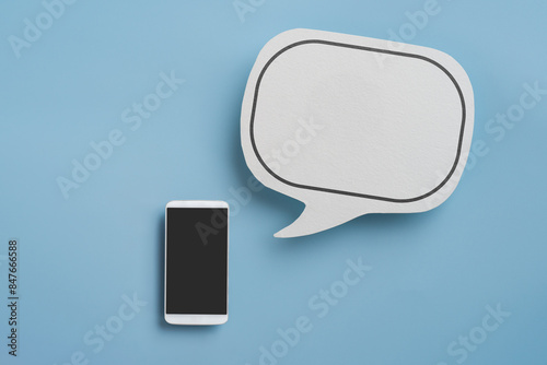 Fototapeta premium real blank white speech bubble paper cut and smartphone on blue background,...