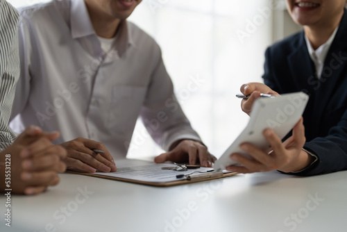 Obraz premium Real Estate Agent explain insurance and agreement contract to client before sign contract