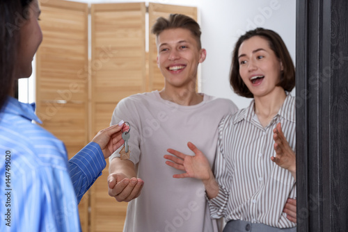 © New Africa, Fototapeta premium Real estate agent giving house key to new owners indoors, selective focus