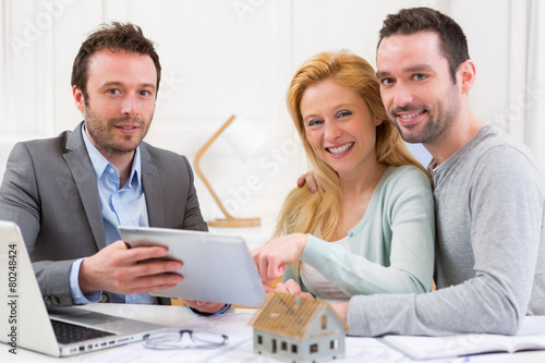 Fototapeta premium Real estate agent present project on tablet to a young couple