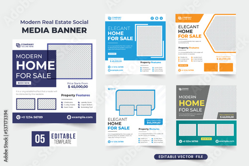 © Iftikhar alam, Naklejka premium Real estate business social media post set vector with purple and blue colors. Home selling service web banner collection for online marketing. Modern house property sale template bundle design.