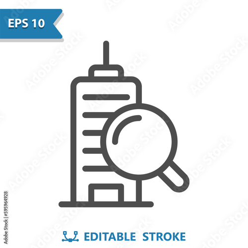 Fototapeta premium Real Estate Icon. Building, Office Building, Apartment Building, Magnifier, Magnifying Glass