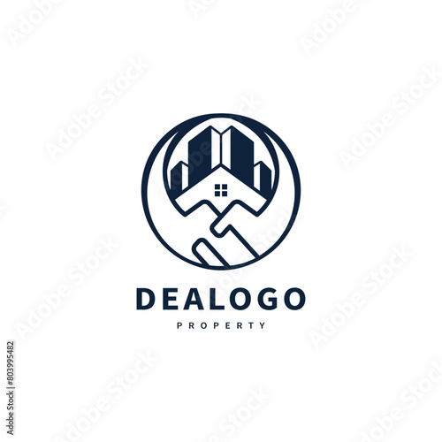Obraz premium Real estate icon illustration with hand shake symbol for property deal logo...