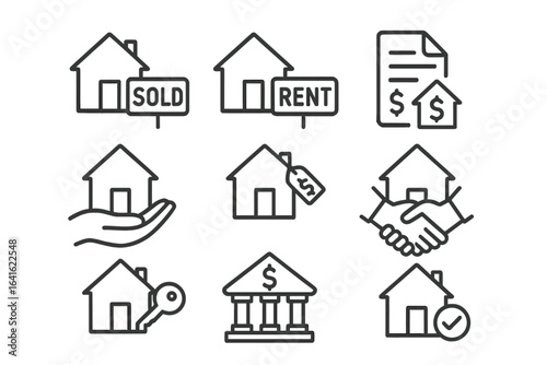 Fototapeta premium Real estate icons set. Vector house sold and rent property signs, contract, handshake, key, mortgage, price tag, purchase agreement, finance. Real estate agency concept illustration.