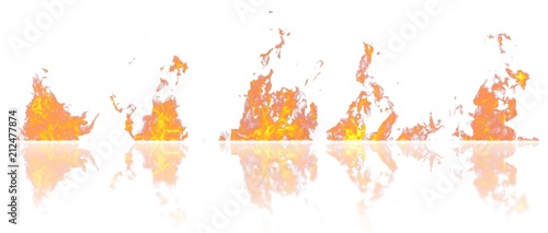 © Dancing Man, Obraz premium Real fire flames with reflection isolated on white background. Mockup on white of 5 flames.