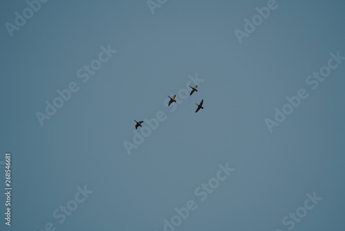 © Maxim, Obraz premium real flock of early summer birds in sunset sky