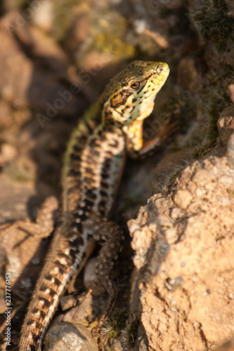 Fototapeta premium Real lizard sitting on a stone illuminated by sunlight.