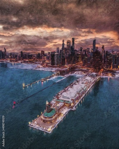 Naklejka premium Real painting modern artistic artwork Chicago USA drawing in oil city center...