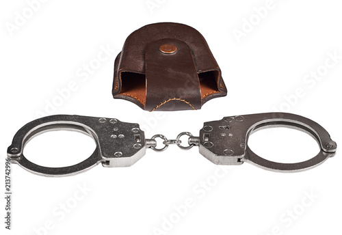 © Maksim Shchur, Obraz premium real police handcuffs with case, isolated on white background