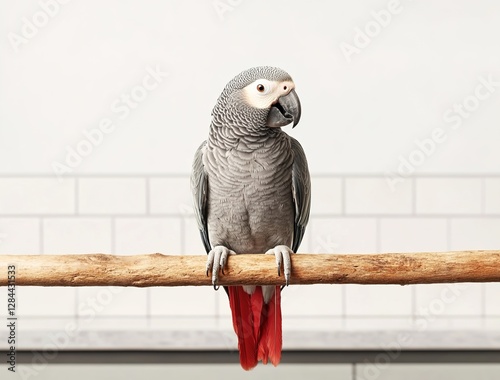 © ma, Obraz premium Realistic African Grey parrot sitting on a branch, isolated against a white background.