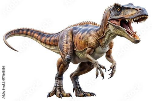 © Akken, Naklejka premium Realistic Allosaurus dinosaur with open mouth and sharp teeth prehistoric, cutout, PNG isolated on white or transparent background