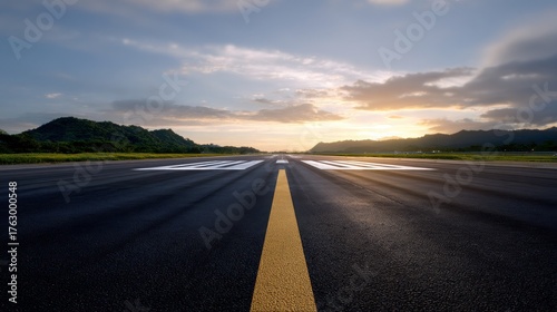 © Gun, Naklejka premium Realistic and Illuminated Airport Runway at Dawn with Mountainous Background and Soft Clouds Reflecting the Early Morning Light
