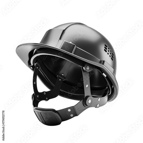© tahu, Naklejka premium Realistic Black Hard Hat Safety Helmet Isolated on Black Background with Subtle Lighting Highlights