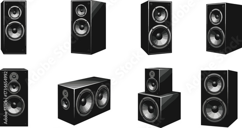© Wajkuruni, Fototapeta premium Realistic black speaker vector set, audio equipment icons, sound system illustration, music device collection, stereo design for stock