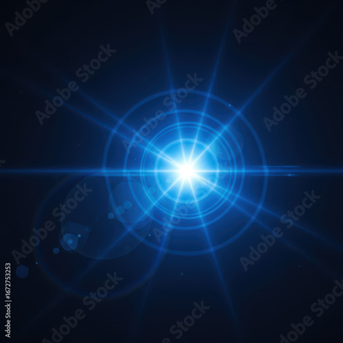 © Naima, Fototapeta premium Realistic blue glowing lens flare light effect on black background