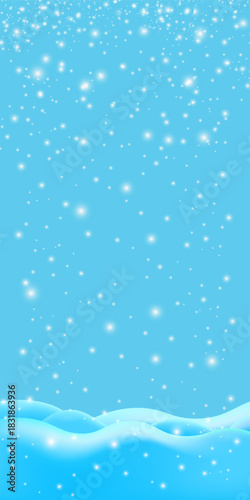 Obraz premium Realistic cartoon snow hills with falling snowflakes and blue sky vertical background. Winter vertical landscape design element with blue snow. Minimal nature composition snowy fields and falling snow