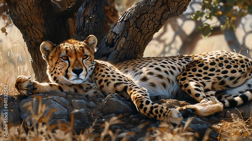 Obraz premium Realistic cheetah resting under a tree, detailed fur and relaxed pose, wild...